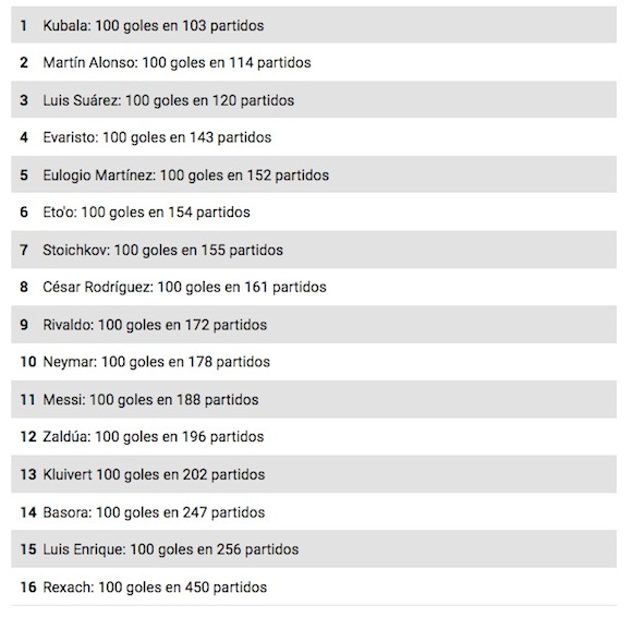 Rekordin më të shpejtë prej 100 golave të shënuar te Barcelona e mban Kubala, i cili një gjë të tillë kishte arritur vetëm pas 103 ndeshjeve. Martin Alonso është i dyti në këtë listë (114 ndeshje, 100 gola), ndërsa i treti është Luis Suarez, i cili shifrën prej 100 golave me fanellën e Barcelonës e kishte arritur vetëm pas 120 ndeshjeve, shkruan “infOSport.mk”.