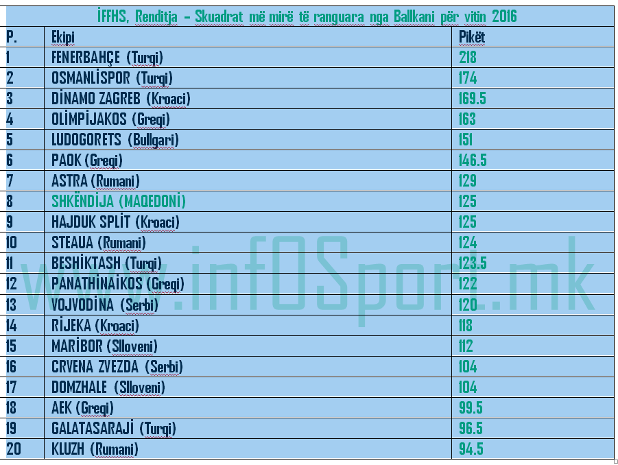 Ndër skuadrat e ranguara në këtë listë nga Ballkani, Shkëndija zë vendin e 8-të, duke lënë pas vetes skuadra mjaft me renome si Beshiktash, Galatasaraj, Panathinaikos, Maribor, Crvena Zvezda, shkruan ”infOSport.mk”.