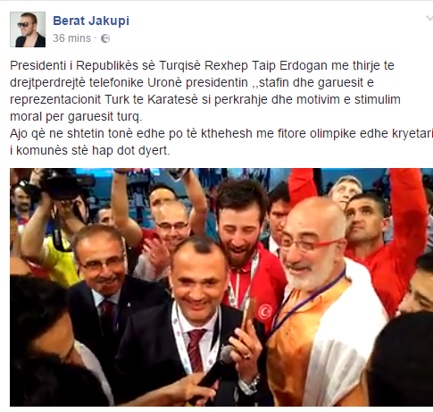 “Presidenti i Republikës së Turqisë, Rexhep Taip Erdogan me thirje të drejtpërdrejtë telefonike uron presidentin, stafin dhe garuesit e reprezentacionit Turk të Karatesë si përkrahje dhe motivim e stimulim moral për garuesit turq. Ajo që në shtetin tonë edhe po të kthehesh me fitore olimpike edhe kryetari i komunës stë hap dot dyert” – kishte shkruar në profilin e tij zyrtarë nënkampioni i Evropës, Berat Jakupi.
