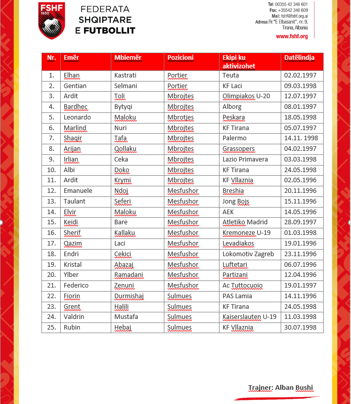 Seleksionuesi i shpresave të Shqipërisë, Alban Bushi ka publikuar ditën e sotme edhe listën me futbollistët që do të grumbullojë për ndeshjet e radhës, ku synimimi Shqipërisë është të evidentojë sa më shumë talente dhe të renditet në vendin e tretë në një grup ku bëjnë pjesë Spanja, Sllovakia, Islanda e Irlanda e Veriut.