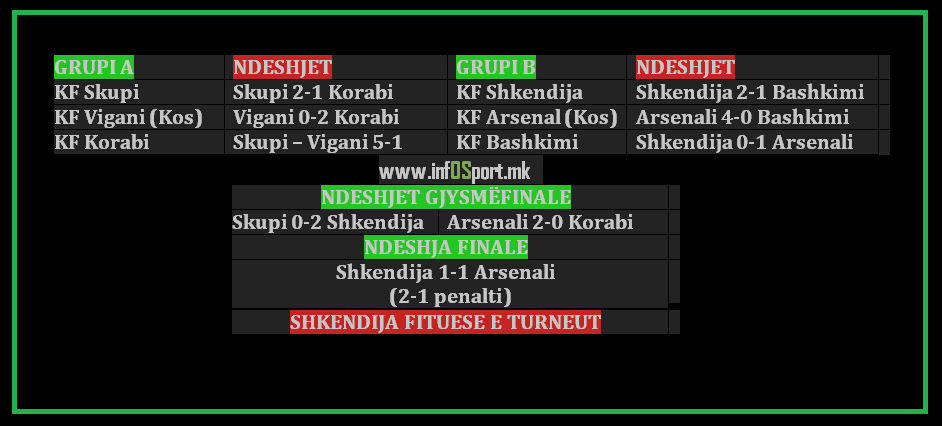 Në këtë turne ku morrën pjesë gjithsej 6 ekipe, përfshirë këtu edhe dy ekipet kosovare, Arsenal dhe Vigani, Shkëndija e Bashkim  Arifit ia doli të triumfojë duke mundur në finalen e madhe skuadrën e Arsenalit, edhe atë vetëm pas ekzekutimit të penaltive, pasi ndeshja në kohën e rregullt u mbyll me rezultatin e barabartë 1:1.