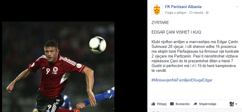 Skuadra nga kryeqendra shqiptare, Partizani ka konfirmuar blerjen më të bujshme të merkatos së verës në kampionatin elitarë shqiptarë. Përmes faqes së tyre zyrtarë në “facebook”, klubi i Partizanit ka konfirmuar se ka arritur marrëveshje me sulmuesin e Kombëtares shqiptare, Edgar Çani, i cili me të “kuqtë” nga Tirana ka firmosur një kontrarë 2-vjeçare.