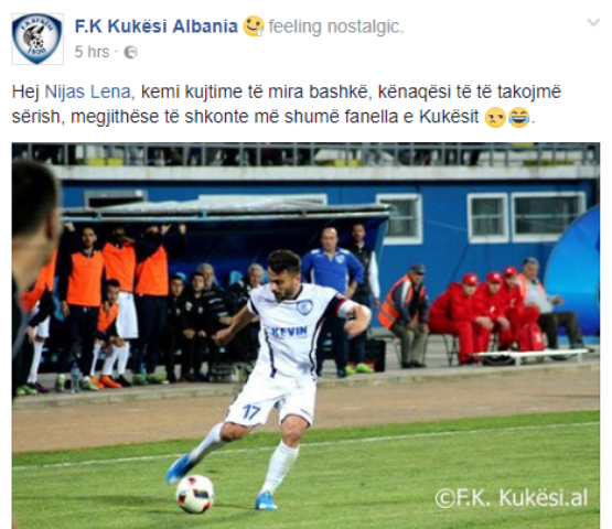 “Hej Nijas Lena, kemi kujtime të mira bashkë, kënaqësi të të takojmë sërish, megjithëse të shkonte më shumë fanella e Kukësit”.