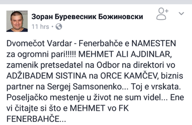 “Dy përballjet Vardar – Fenerbahçe janë kurdisur për shuma të mëdha parash!!! Mehmet Ali Ajdinlar, zëvendës kryetari i bordit të drejtorëve të spitalit “Axhibadem Sistina” të Orce Kamçev, biznes partneri i Sergej Samsonenkos… Ai është lidhja. Kurdisje më katundarçe nuk kam parë kurrë në jetë…Ja lexoni se çfarë pozicioni në FK Fenerbahçe ka Mehmet”, ka shkruar Bozhinovski në profilin e tij në “facebook”.
