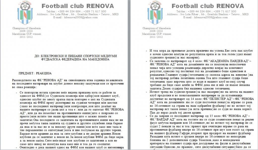 “FFM për disa klube është nënë e për disa njerkë. Në momentin kur skuadra arriti të regjistrojë seri të rezultateve të mira dhe u ngjit më lartë në renditjen tabelare, shumë personave që janë brenda strukturës së federatës po i’u pengon dhe të njejtit në çfarë do llojë mënyrë po mundohen t’i ndalin sukseset tona përmes arbitrave dhe kontrollorëve”, thuhet mes tjerash në kumtesën e Renovës.