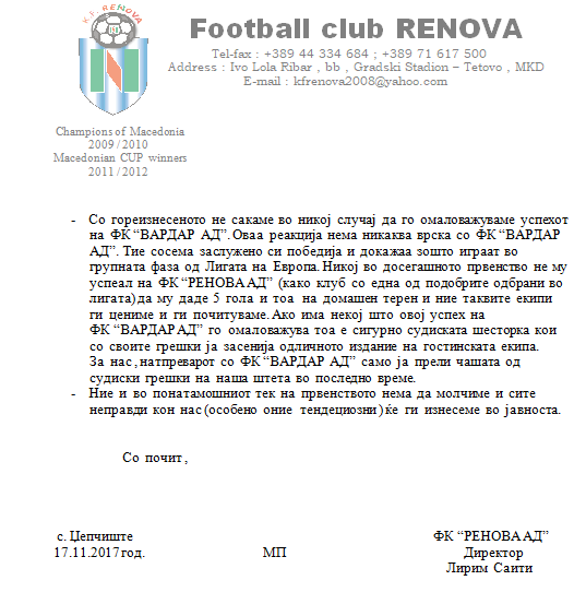 Për pakënaqësitë e referimit të Dejan Meçkarovskit në ndeshjen e xhiros së 15-të në Ligën e Parë të futbollit të Maqedonisë ndërmjet Renovës dhe Vardarit, skuadra nga Xhepçishti ka reaguar sot ndaj Federatës së futbollit të Maqedonisë.