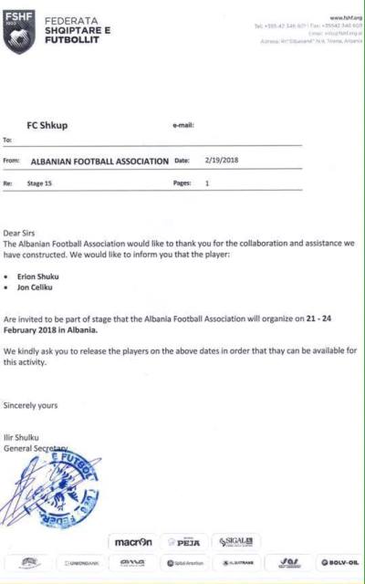 Federata e Futbollit të Shqipërisë përmes një letre zyrtare drejtuar FC Shkupit iu ka bërë ftesë dy futbollistëve në fjalë. Kombëtarja “kuqezi” U15 do të grumbullohet me 21-24 shkurt, që në mesin e tyre do të jenë edhe dy shkupjanët Shuku dhe Celiku. /InfOSport.mk