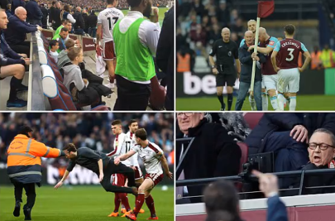 Ndeshja e javës së 30-të mes Uest Hamit dhe Bërnlit ka degjeneruar në dhunë gjatë ditës së sotme, teksa në pjesën e dytë disa huliganë të skuadrës vendase u përleshën me futbollistët e tyre, teksa kërkonin që të sulmonin edhe pronarët e klubit, Dejvid Gold dhe Dejvid Sallivan.