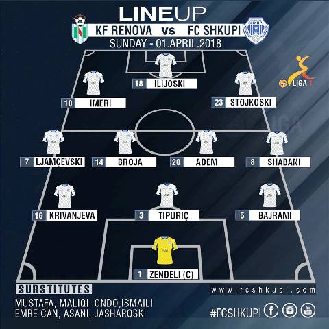 Në portë është rikthyer kapiteni Suat Zendeli, teksa në mbrojtje ka vendosur treshen Tipuriç, Bajrami dhe Krivanjeva, në mesfushë do të veprojnë Bllagoja Ljmaçevski në të majtë, Rron Broja dhe Ermedin Adem do të jenë në qendër të mesfushës, teksa Bunjamin Shabani do të luaj në krahun e djathtë.