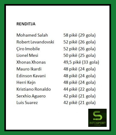 Sallah kryeson klasifikimin aktualisht në kuotën e 58 pikëve, falë 29 golave që ka shënuar këtë sezon në Premierligë, ndërsa pas tij në kuotën e 52 pikëve, apo 26 golave të shënuar qëndrojnë Robert Levandovski i Bajernit të Munihut dhe Çiro Immobile i Lacios.