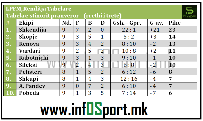 Më pas renditet Renova me 13 pikë, Vardari me 11, teksa Rabotniçki dhe Sileksi me nga 10 pikë renditen në pozitat 5 dhe 6, duke lënë pas vetes Pelisterin me 8 pikë. Sa i përket FC Shkupit, skuadra nga Çairi ka regjistruar 5 pikë më pak se në fazën e parë, kur skuadra drejtohej nga Ardian Nuhiu dhe ishte pa sponzor, duke qenë në kuotën e 12 pikëve në 9 ndeshje. Në fazën e tretë FC Shkupi në 8 ndeshje ka regjistruar vetëm 1 fitore, 4 barazime dhe 3 disfata, duke ju rikujtuar se këtë fazë ka edhe një ndeshje më pak, atë të javës së 26-të kundër Pelisterit.