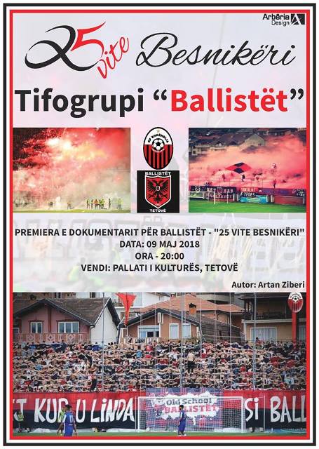 PREMIERA E DOKUMENTARIT PËR BALLISTËT – "25 VITE BESNIKËRI"DATA: 09 MAJ 2018ORA – 20:00VENDI: PALLATI I KULTURËS, TETOVË