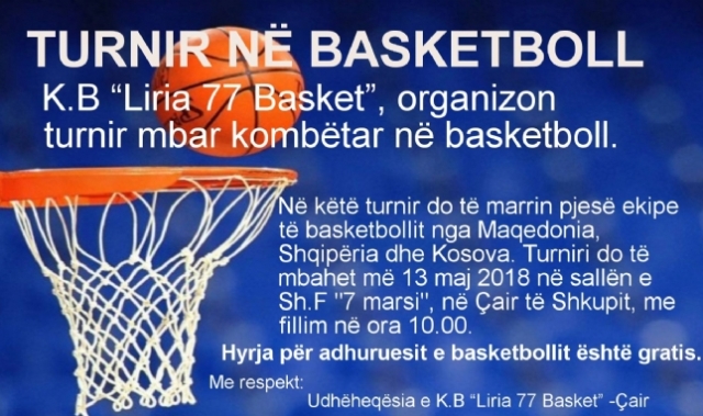 K.B “Liria 77 Basket”, organizon turnir mbarë kombëtar në basketboll. Në këtë turnir do të marrin pjesë ekipe të basketbollit nga Shqipëria dhe Kosova, ndërsa i njëjti do të zhvillohet këtë fundjavë (13 maj) në sallën e Sh.F “7 marsi” në Çair të Shkupit, me fillim në ora 10.00.