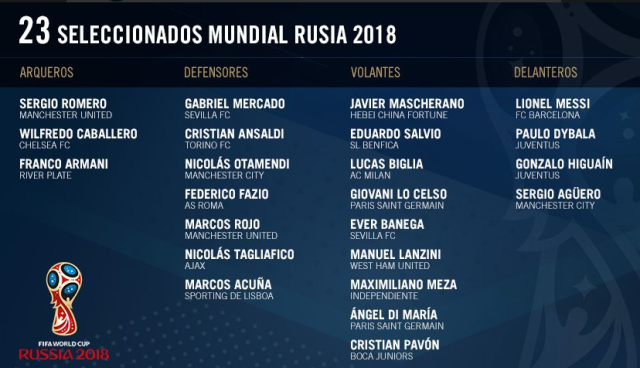 Një javë më parë seleksionuesi argjentinas kishte publikuar listën e zgjeruar prej 35 futbollistëve. Enco Peres nga rradhët e River Plejt, Rikardo Senturion dhe Lautaro Martinez nga Rasing, gjithashtu nuk bëjnë pjesë në formacionin përfundimtarë të Kombëtares argjentinase, njëjtë sikurse edhe portieri i Tigres, Nahuel Gusman, i cili në moment të fundit u zëvendësua nga Franko Armani i River Plejt. Dy portierët tjetër të “gauçosëve” në Rusi do të jenë Serhio Romero (Mançester Junajted) dhe Vilfredo Kabajero (Çelzi).