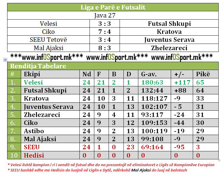 Në 24 ndeshje të zhvilluara Juventus Serava tuboi 31 pikë, duke u renditur në fund në pozitën e 4-të, pas Kratovës së vendit të tretë, teksa rikujtojmë se kampion i këtij sezoni me 65 pikë, vetëm një më shumë se Futsal Shkupi në pozitën e dytë, doli të jetë Velesi, që në xhiron e fundit para tifozëve të vetë, në një ndeshje me shumë kthesa në rezultat dhe shumë tension barazoi 3:3 në duelin direkt ndaj skuadrës “bardhekaltër” nga Çairi, që në fund i mjaftoi për t’iu gëzuar titullit të këtij edicioni.