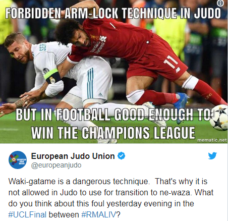 Por mjaft i veçantë është qëndrimi në Twitter i Unionit Europian të Xhudos, që ka ironizuar kështu me gjestin e kapitenit të Realit të Madridit: “Arm-lock” është një teknikë e ndaluar në xhudo, kurse në Ligën e Kampionëve mjafton për të fituar trofeun”.