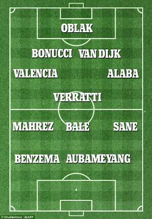 Para tij rreshtohen Antonio Valencia nga e djathta (Ekuador dhe Mançester Junajted), Virxhil Van Dajk (Holandë dhe Liverpull), Leonardo Bonuçi (Itali dhe Milan) si dhe David Alaba (Austri dhe Bajern Munih).
