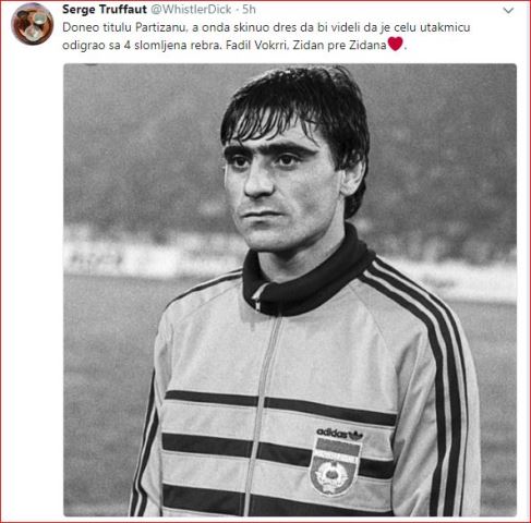 “I solli titullin Partizanit, e më pas hoqi fanellën që të shihnin të gjithë se gjatë tërë ndeshjes kishte luajtur me 4 brinjë të thyer. Fadil Vokrri, Zidane para Zidanit”, kishte shkruar Sergej.
