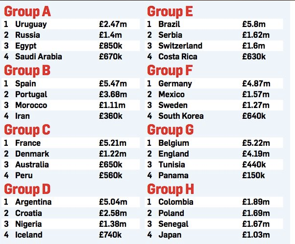 Kupa e Botës nga kjo javë pret futbollistët më të mirë në botë dhe gjithsesi më të paguarit. Nga një studim i bërë nga i cili është krijuar lista e pagave mesatare që marrin lojtarët e kombëtareve që do të paraqiten në Kupën e Botës, në vendin e parë është Brazili.