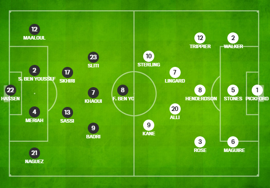 Mesfushori i Sandërlend, Uahbi Khazri nuk ka luajtur që nga dëmtimi që pësoi në ije në prill, kur ishte huazim te Ren. Por kapiteni i Tunizisë mendohet se do të jetë në fushë. Portieri me eksperiencë, Ajmen Mathluthi duhet të jetë titullar, ndërsa Ferjani Sasi dhe Eljes Skhiri, pritet të jenë mes titullarëve.