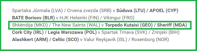 Në rast se Shkëndija kalon këtë kundërshtarë, në raundin e dytë të përzgjedhurit e trajnerit Qatip Osmani do të mirëpresin fituesin nga dueli Torpedo Kutaishi nga Gjeorgjia dhe Sherif Tiraspol nga Moldavia.