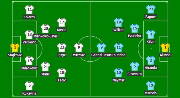 Sa i përket formacioneve, Tite e ka grupin e plotë me përjashtim të Dagllas Kostas, i cili është dëmtuar dhe i ka dhënë fund Botërorit. Shiritin e kapitenit te Kombëtarja e Brazilit sonte do ta mbajë futbollisti i Interit, Miranda, teksa në anën tjetër bie në sy mungesa e Ivanoviç, që do të qëndrojë në stol.