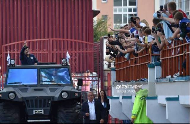 Ndryshe legjenda Diego Armando Maradona ishte pritur si një yll, i shoqëruar nga mijëra tifozë gjatë gjithë rrugëtimit të tij nga aeroporti, deri në stadium, rrugë të cilën e bëri me nëj makinë mjaft të veçantë që i dhuroi klubi si shenjë mirënjohje që kishte pranuar të marrë postin e ofruar nga ana e tyre.