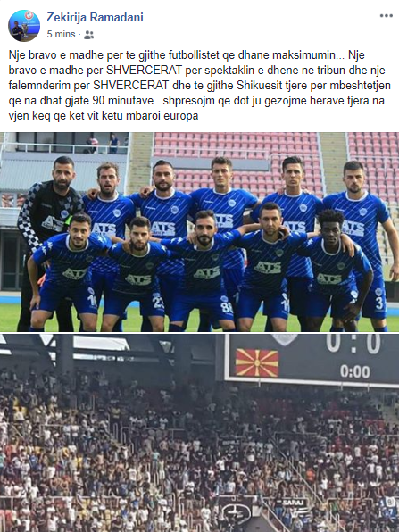“Një bravo e madhe për të gjithë futbollistët që dhanë maksimumin. Një bravo e madhe për SHVERCERAT, për spektaklin e dhënë në tribunë dhe një falemenderim për SHVERCERAT dhe të gjithë shikuesit tjerë për mbështetjen që na dhatë gjatë 90 minutave. Shpresojmë që do të ju gëzojmë herave tjera na vjen keq që këtë vit këtu mbaroi Europa” – kishte shkruar strategu shkupjan, Zekirja Ramadani.