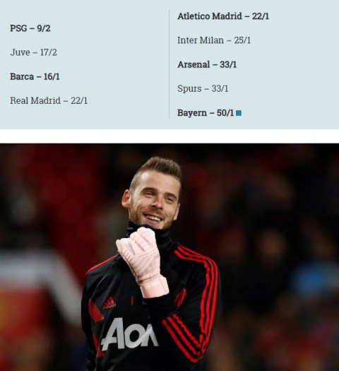 Skuadra franceze favorizohet nga bastoret, duke marr shanset 9/2 për transferimin e De Geas, ndërsa pas tyre renditet Barcelona me 16/1.