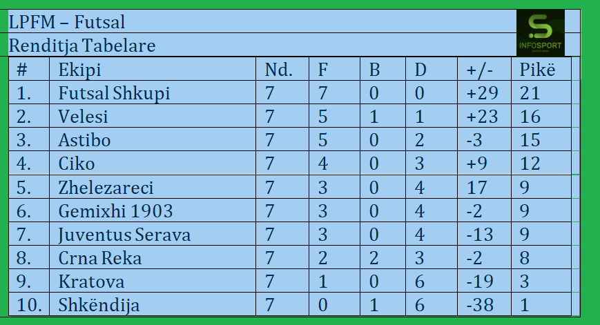 21 pikë në 7 javë për Futsal Shkupin, që lë pas vetes kampionët në fuqi të Velesit, teksa sa u përket dy skuadrave tjera shqiptare në Ligën e Parë të Futsalit, Juventus Serava me 9 pikë renditet në pozitën e 7-të, ndërkohë Shkëndija me vetëm një pikë mban pozitën e fundit në renditje.