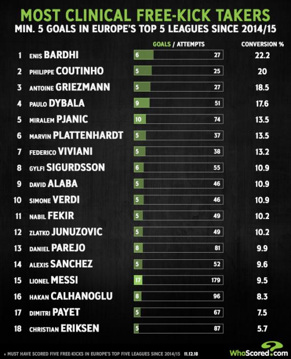 Antuan Grizman ka numrin e njëjtë të tentativave për gol nga gjuajtjet e lira, si të Enis Bardhit (27), mirëpo ka të shënuar vetëm 5 gola, duke u renditur i treti në këtë listë me 18.5% të finalizimeve, teksa Lionel Messi ndodhet vetëm në pozitën e 15-të.