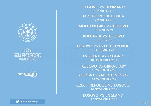 Ndeshjen e parë kualifikuese, Kosova do ta zhvillojë kundër Bullgarisë me 25 mars në stadiumin e Prishtinës, ndërsa edhe ndeshjen e fundit të vitit aktual do ta mbyll në ‘Fadil Vokrri’ me super ndeshjen eliminatore kundër Anglisë.