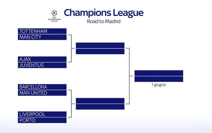 Gjithashtu u mësuan edhe dyshet e gjysmëfinales, ku fituesi mes sfidës Totenham-Mançester Siti do të përballet me skuadrën fituese nga çifti midis Ajaksit dhe Juventusit, ndërkohë në dyshen tjetër të gjysmëfianles, fituesi i përballjes Barcelona-Mançester Junajted do të takohet me fituesin nga ndeshja Liverpull-Porto.