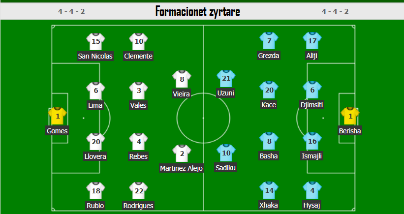 Disfata e fundit bëri që Federata Shqiptare e Futbollit të prish kontratën me trajnerin Kristian Panuçi, ashtu që sonte në këtë transfertë “kuqezinjtë” do të udhëhiqen nga ndihmësi Ervin Bulku dhe Sulejman Mema. Që të dy kanë hartuar një formacion 4-4-2, me Armando Sadikun dhe Myrto Uzunin në sulm, ndërsa bie në sy edhe paraqitja e kumanovarit Naser Aliji. Sa i përket pjesës tjetër të skuadrës, ajo thuajse ishte e pritur, duke pasur parasysh se do të kemi edhe një mesfushë më ofenzive, me Grezdën dhe Kaçen, por edhe me dy futbollistët me mjaft përvojë Bashën dhe Xhakën.