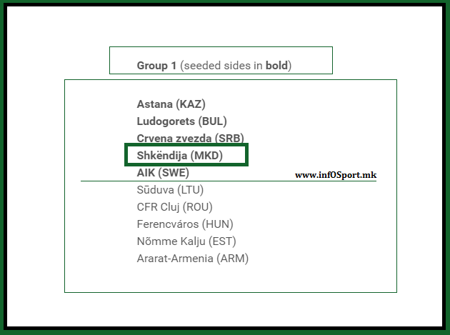 Kësisoj Shkëndija ndodhet në grupin 1, bashkë edhe me skuadrat tjera bartëse, Astana (Kazakistan), Ludogorets (Bullgari), Crvena Zvezda (Serbi) dhe AIK (Suedi).