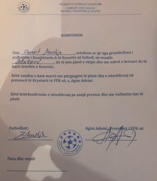 “Gazeta Express” ka siguruar edhe dokumentin ku shkruhet: “Unë Florent Muslija zotohem se nga grumbullimi i ardhshëm i Kombëtares së Kosovës në futboll në shtator do të jem pjesë e ekipit dhe me nder e krenari do të barti fanellën e Kosovës”.