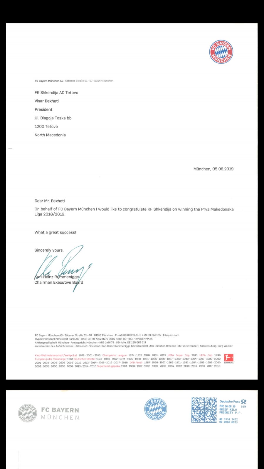 Telegrami që mban firmën e presidentit të bavarezëve, Karl-Heinz Rummenigge i drejtohet presidentit të Shkëndijës, Visar Bexheti, duke i uruar fitimin e titullit kampion në Ligën e Parë të Futbollit të Maqedonisë për sezonin garues 2018/19.