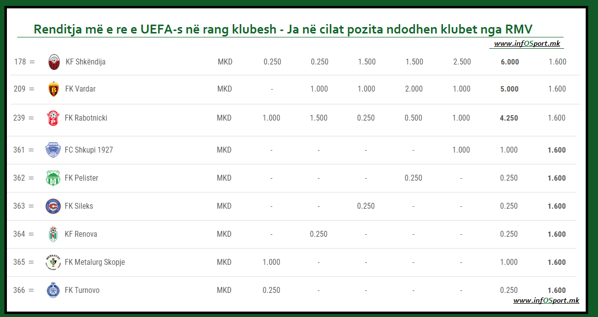 Pas tyre në pozitën e 361-të ndodhet edhe një skuadër tjetër nga kryeqendra jonë, FC Shkupi, që tashmë dy vite me rradhë po luan në eliminatoret e Liga Europa, ndërsa vijojnë skuadrat si Pelisteri, Renova, Sileksi, Metalurgu dhe Horizont Turnova, me këta dy të fundit që tashmë garojnë në ligat më të ulëta të Maqedonisë së Veriut.