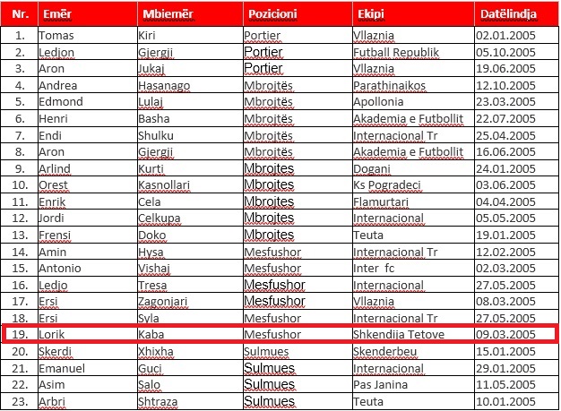 Shqipëria e 15 vjeçarëve e drejtuar nga trajneri Armand Dama fillon nesër grumbullimin për këtë turne. Trajneri i kuqezinjve të vegjël ka grumbulluar 23 lojtarë, të gjitha këta të datëlindjes 2005, ndërsa në mesin e tyre bie në si edhe emri i mesfushorit të Shkëndijës së Tetovës, Lorik Kaba.