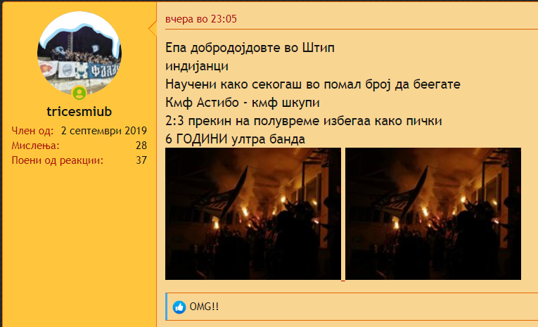 Mirëpo sikur të mos mjaftonte e gjithë kjo, nën grupi i tifozëve “Falanga”, të njohur me emrin “Ultra Band”, ndryshe aktorët kryesor të mbrëmjes së sotme në palestrën e qytetit në Shtip, vazhduan të mburren me turpin e tyre, duke ofenduar sërish shqiptarët. Këtë herë përmes forumeve online, ata quajtën shqiptarët “indianë”, ndërsa gjithashtu i fyen me fjalë vullgare, që ju përkasin vetëm tifozëve të rangut të ulët.