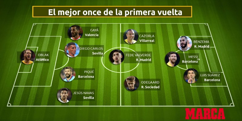 Mesfusha përbëhet nga treshja, Martin Odegaard (Real Sociedad), Fede Valverde (Real Madrid) dhe Santi Kazorla (Viljareal), derisa sulmi përbëhet nga Lionel Messi dhe Luis Suarez i Barcelonës, si dhe Karim Benzema i Real Madridit.