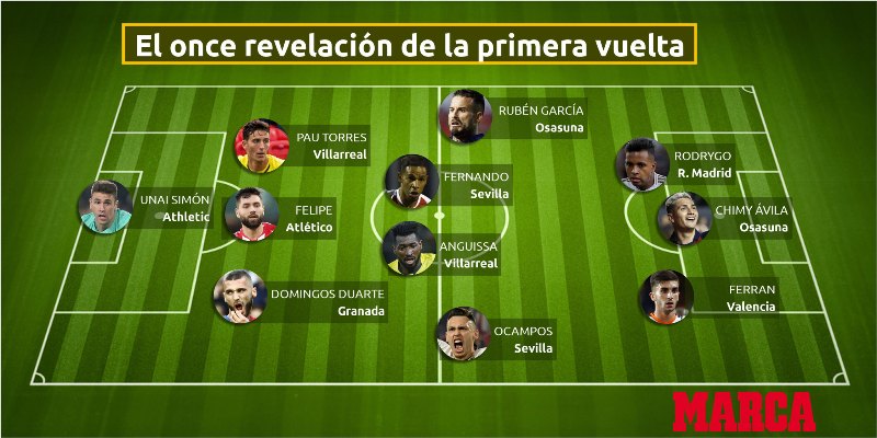 Formacioni me lojtarët e ri të cilët kanë qenë zbulim i sezonit përbëhet nga portieri i Atletik Bilbaos, Unai Simon.
