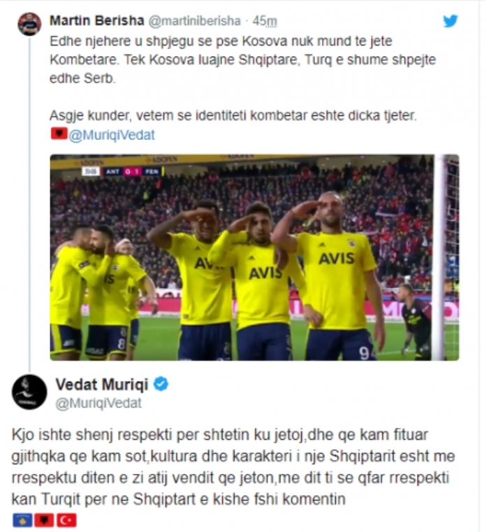 “Edhe njehere u shpjegu se pse Kosova nuk mund te jete Kombetare. Tek Kosova luajne Shqiptare, Turq e shume shpejte edhe Serb. Asgje kunder, vetem se identiteti kombetar eshte dicka tjeter“, ka shkruar Berisha.