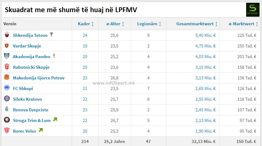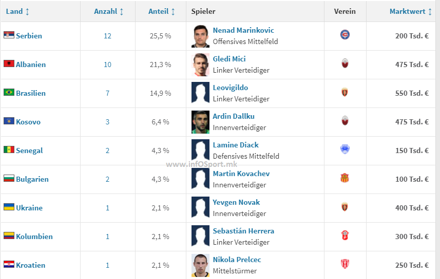 Shkëndija është skuadra me më shumë futbollistë të huaj, gjithsej 9, e pasuar nga FC Shkupi me 7, Sileksi 6, Struga Trim 5, për të vijuar me Rabotniçkin, Akademia Pandev, Makedonija Gj.P dhe Borecin, që kanë nga 4 të huaj, derisa Vardari dhe Renova kanë vetëm nga dy futbollistë jashtë kufijve të Maqedonisë së Veriut.