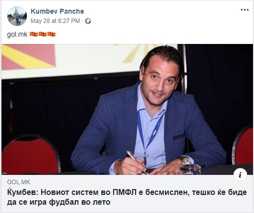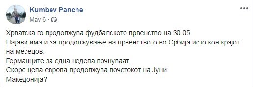 Futbolli në Maqedoninë e Veriut mbeti i paralizuar nga pandemia me CoVid-19 që krahas pauzës së detyrueshme thuajse tre mujore, javën e shkuar rezultoi me ndërperje përfundimtare të sezonit garues 2019/2020 nga ana e Federatës së Futbollit të Maqedonisë. Një vendim që krahas pakënaqësisë së disa klubeve, gjithsesi se kënaqi një pjesë bukur të mirë të skuadrave dhe opinionit apo edhe atyre që gjithë kohën kritikonin e sugjeronin se në vendin tonë nuk ka kushte për të vazhduar ky sezon. Këtë qëndrim publikisht e shprehte edhe kryetari i Sindikatës së futbollistëve të Maqedonisë, Pançe Qumbev. Por mbetet dilemë e madhe se sa ishte i sinqertë ky qëndrim i njeriut që drejton subjektin që “pretendon” të mbrojë të drejtat e futbollistëve?! Për ironi dhe çudi kur FFM ende nuk kishte dalë me qëndrim rreth vazhdimit të sezonit, pikërisht Qumbev pretendonte se shtëpia e futbollit vendor vonohej me vendimin, madje duke ironizuar në profilin e tij në facebook me një postim më 6 maj ku potenconte se në Kroaci, Serbi, Gjermani dhe thuajse gjithandej në Europë do të vazhdonte futbolli, ndërsa me një pikëpyetje pas emrit të Maqedonisë shpreh çudinë e tij se këtu nuk ndiqej ky “trend”!