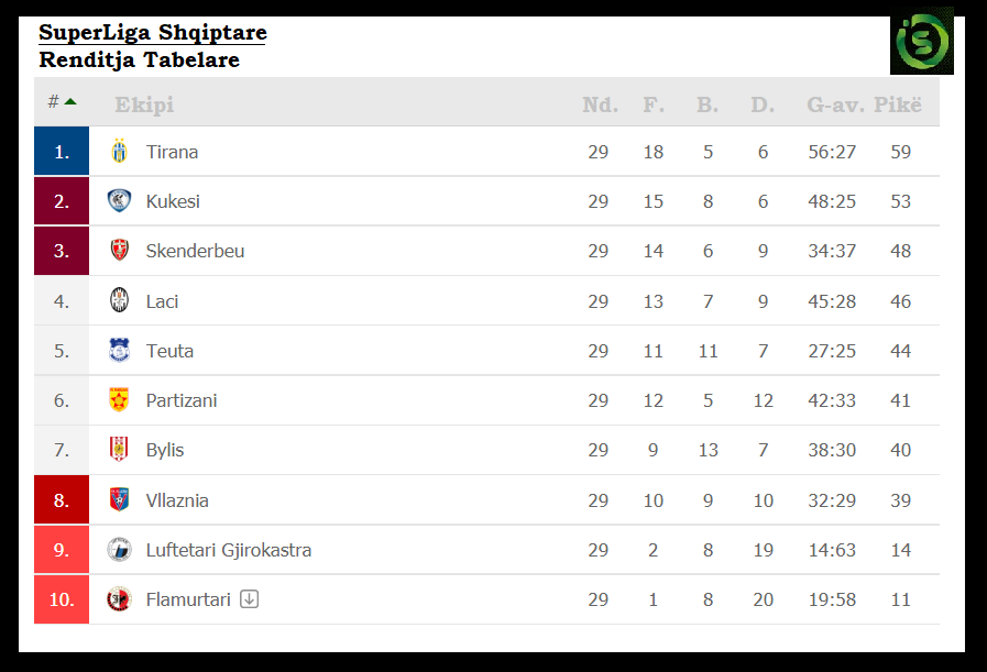 Pason Laçi në pozitën e katërt me 46 pikë, Teuta me 44 pikë mban pozitën e 5-të, ndërkohë kampionët në fuqi të Partizanit tashmë ndodhen në pozitën e 6-të me 41 pikë.