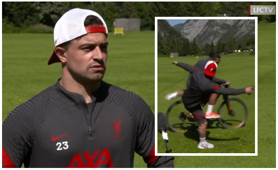 Xherdan Shaqiri “tërbohet” me shokët e skuadrës gjatë një interviste për “LFC TV”. Teksa po jepte intervistën e tij për kanalin zyrtarë të klubit amë, dy bashkëlojtarët e tij, Virxhil van Dijk dhe Xheorxhino Uijnaldum vendosën të provokojnë futbollistin shqiptarë, duke i kaluar rrotull me biçikleta.
