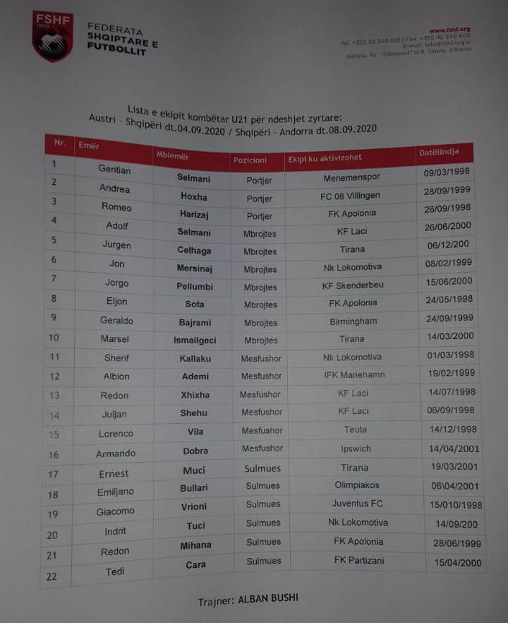 Trajneri i Kombëtares U21 të Shqipërisë, Alban Bushi, ka bërë publike listën e futbollistëve të grumbulluar për 2 ndeshjet zyrtare që ekipi shpresa do ti zhvillojë në datat 4 dhe 8 shtator përballë Austrisë, respektivisht Andorrës, transmeton “infOSport.mk”.