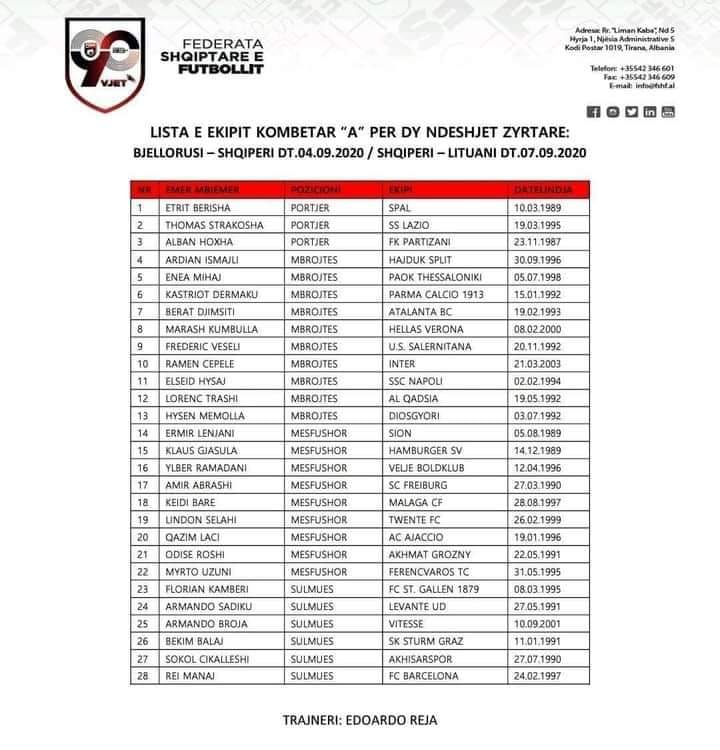 Trajneri i Kombëtares së Shqipërisë, Edi Reja, ka shpallur listën e futbollistëve për dy ndeshjet që do të luhen në 4 dhe 7 shtator, përkatësisht me Bjellorusinë si dhe Lituaninë, njofton “infOSport.mk”.