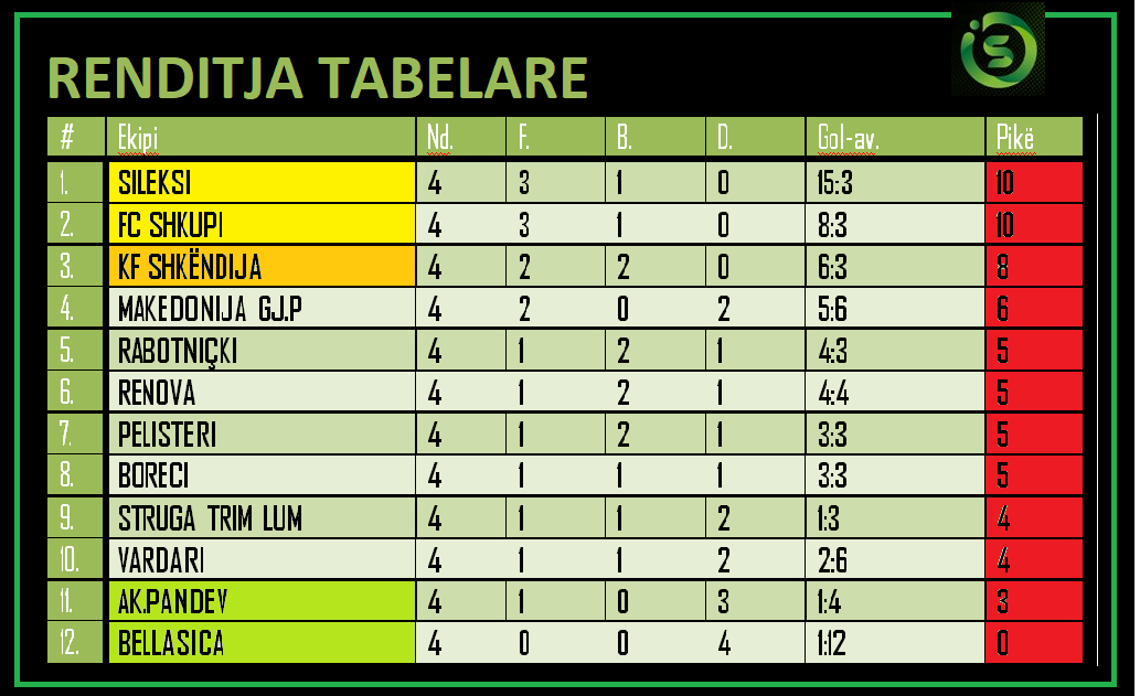 Me ndeshjet Sileksi – Renova (3:1) dhe Shkëndija – Boreci (1:1) edhe zyrtarisht është mbyllur java e katërt në elitën e futbollit vendor, pas së cilës pason një pauzë dy javore për shkak ndeshjeve të përfaqësueses së Maqedonisë në kuadër të Ligës së Kombeve, njofton “infOSport.mk”.